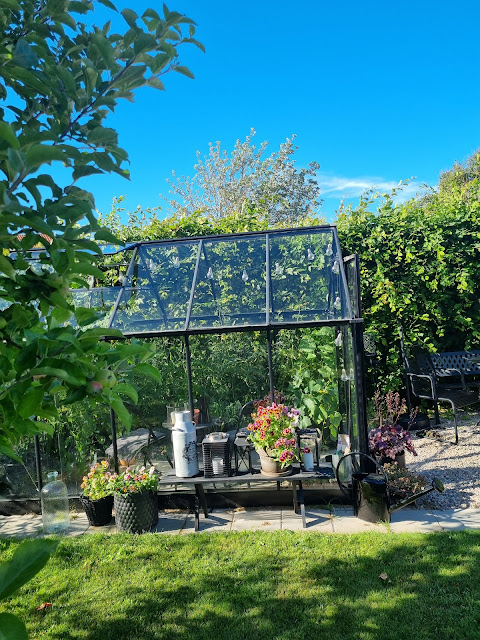 Jag bjöd på lite fika i växthuset. Så mysigt att sitta där och fika det gör vi alldeles för sällan.
