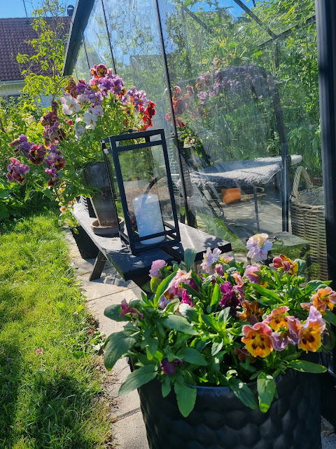 Utanför mitt växthus blommar fortfarande mina penseer för fullt.